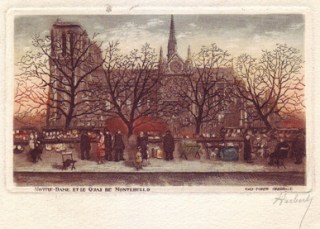 There’s been a severe Hubert drought lately. So much so, I found myself questioning whether Hubert’s etchings are nothing more than pigments of my imagination. To atone for my recent bout of doubt, in a rare moment of repose, I sat down with my laptop (and a wine spritzer for fortification) to catch up on some Hubert hunting. Lo and behold, a Hubert etching for sale on ebay popped up on my screen, coincidentally of a scene set in the very location along the Seine where I’ve been seeking out bouquinistes.
