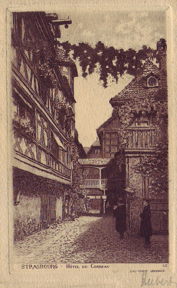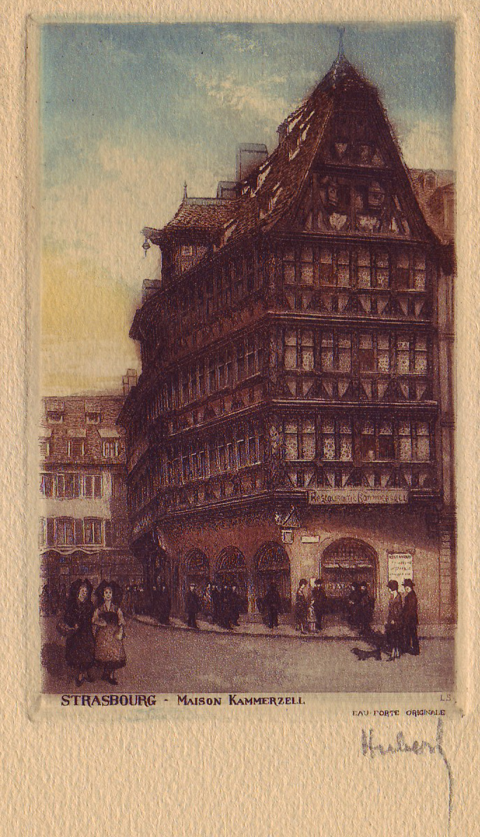 That notable epigram “plus ça change, plus c’est la même chose” also holds true for Hubert. When I recently heard that the brother of a close friend was planning a vacation in France (with a side trip to Strasbourg, no less) I supplied him with copies of all of my Hubert etchings set in Strasbourg just in case the opportunity to do a little reconnaissance presented itself. True to his word he did investigate, kindly devoting a portion of his short stay to visit the scenes depicted in my etchings and he meticulously photographed the identical buildings. Despite the fact that at least 100 years have passed since Hubert etched those scenes in Strasbourg, remarkably the sites have changed very little. Yes, the more things change, the more they stay the same. That unfortunately also holds true for the fact that, still, no one knows my Hubert…
